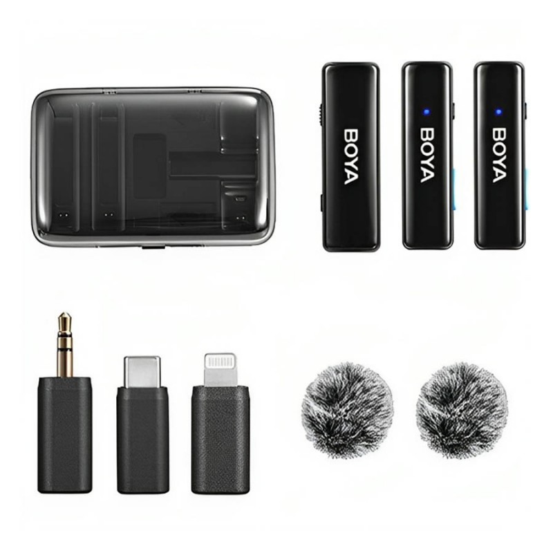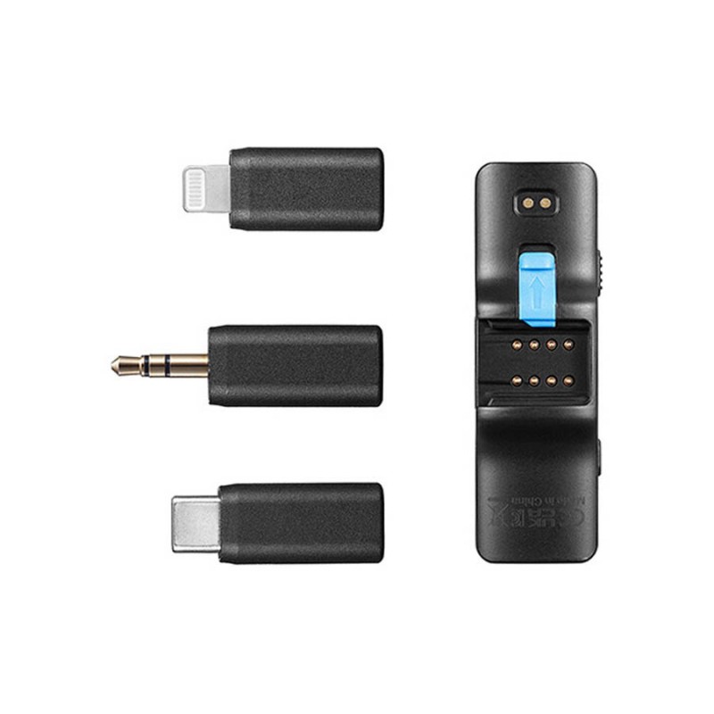 مناسب برای تولید محتوا و خبرنگاران میدانی قابلیت ضبط صدای ۲ نفر به همراه دوربین یا گوشی هوشمند ۲ عدد فرستنده با میکروفون داخلی گیرنده ۲ کانال کانکتورهای قابل تعویض ۳.۵ میلیمتری، USB-C و لایتنینگ برد بیسیم تا ۱۰۰ متر پورت شارژ USB-C چراغهای نشانگر، ۶ سطح گین مختلف باتریهای داخلی قابل شارژ کیس شارژ