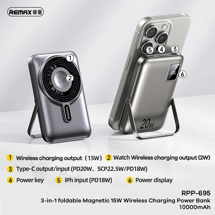 پاوربانک مگنتیک وایرلس ریمکس مدل RPP-695 با ظرفیت ۱۰٬۰۰۰ میلیآمپر ساعت و توان خروجی ۱۵ وات، انتخابی ایدهآل برای کاربرانی است که به دنبال یک شارژر همراه کارآمد، شیک و چندمنظوره هستند.